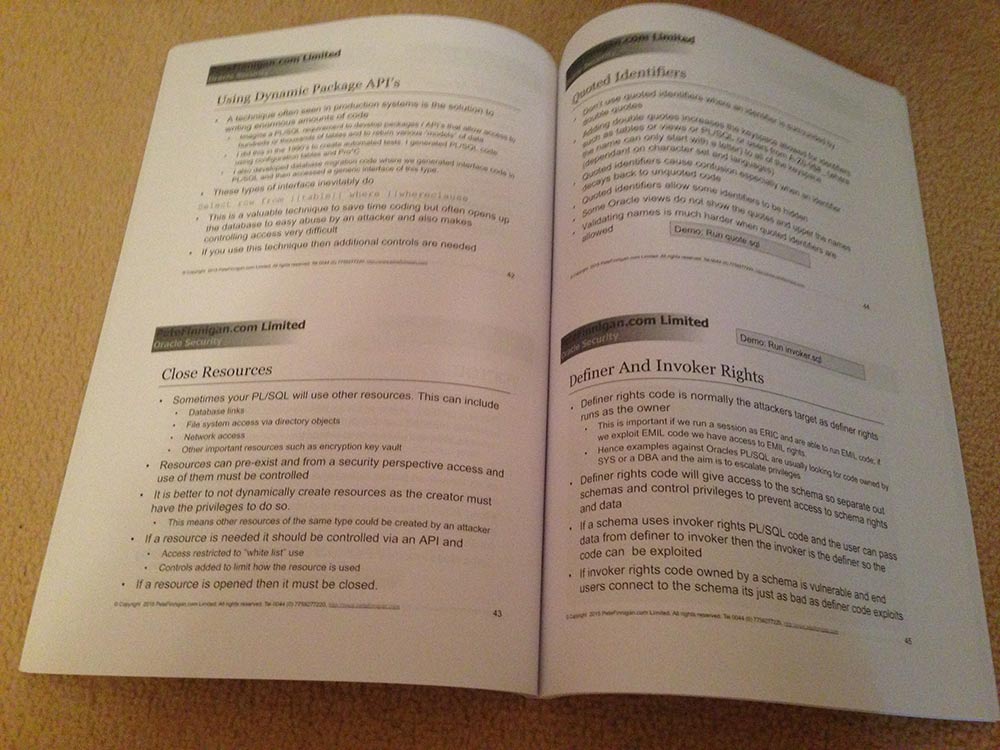 Please email me on pete@petefinnigan.com if you are interested to purchase one of these course books that we have for sale. Please also let me know your postal address and I will get an accurate postage price from the post office. Also as we are registered for UK VAT then we may need to also add VAT dependant on where you are. Please get in touch if you would like to purchase one of these course manuals but hurry we don't have many and we will not be repeating this.